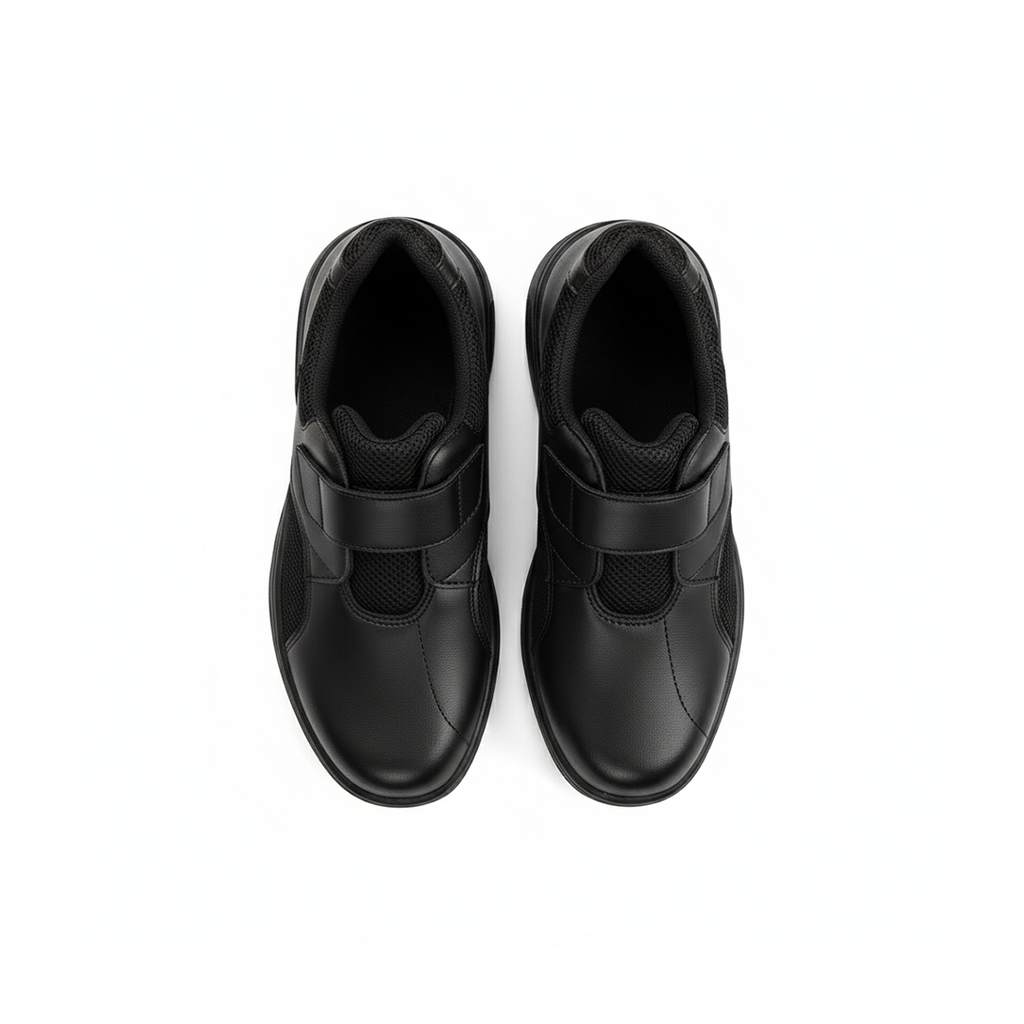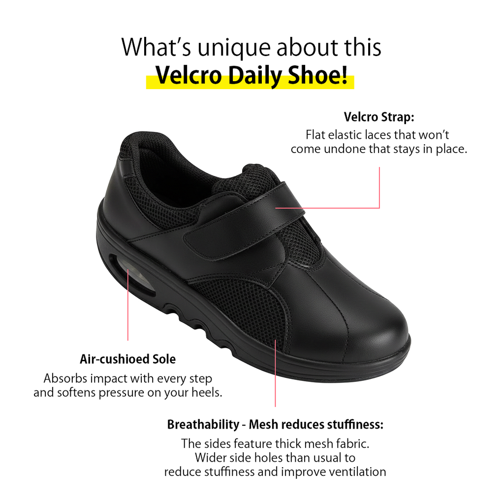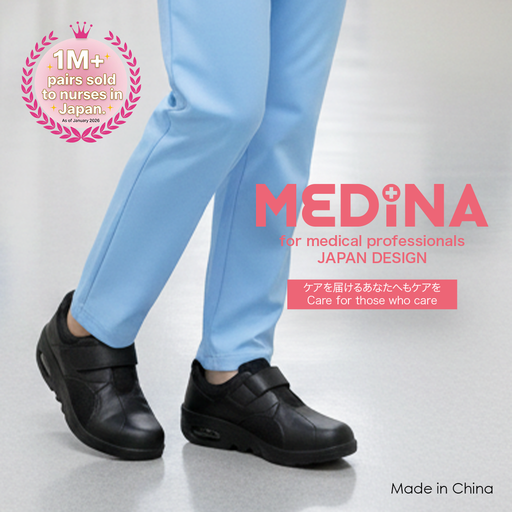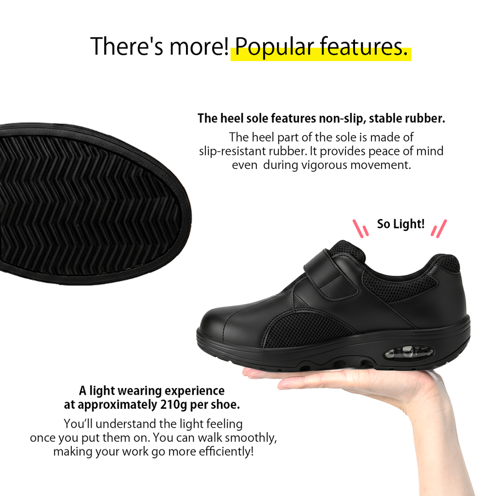 Lightweight and comfortable, these nurse shoes feature breathable mesh, an air-cushioned sole for shock absorption, and elastic laces for an easy fit. The 3E wide design and slip-resistant rubber outsole provide all-day comfort and stability. Made from durable synthetic leather in Japan.